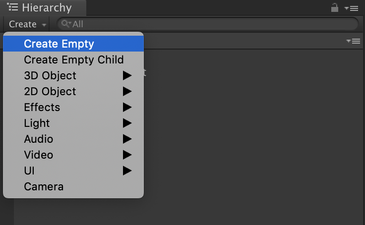 Hierachy창에서 create -> create Empty를 클릭합니다.