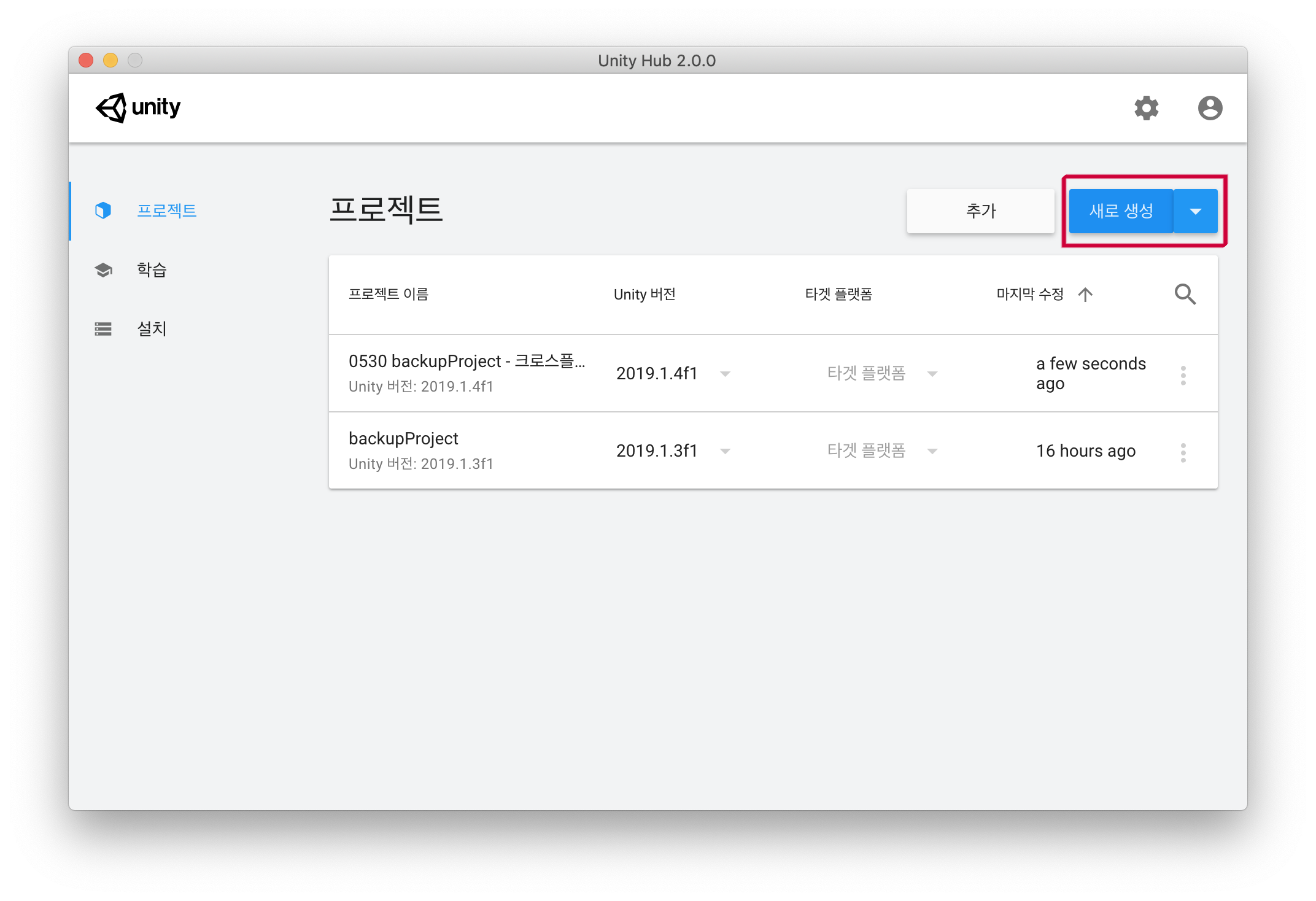 Unity Hub을 열어 새 프로젝트를 생성합니다.