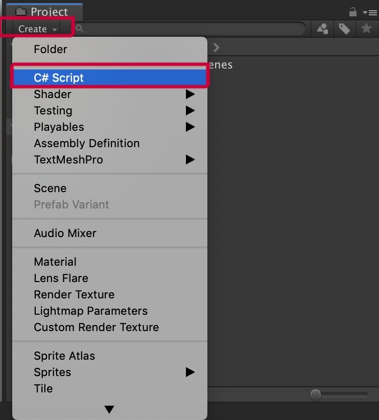 생성을 완료하였으면 C#스크립트 파일을 작성합니다. 프로젝트 창 왼쪽 상단의 create > c# script 클릭