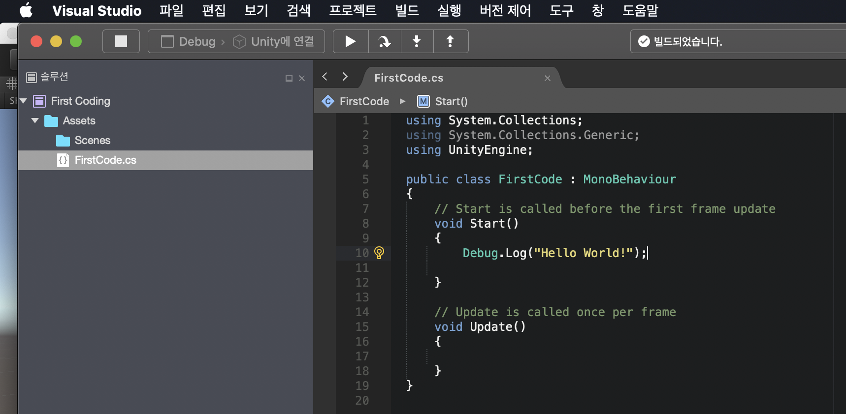 플레이버튼을 눌러 플레이모드에 진입합니다. 아래와 같이 console창에 Hello World라는 문구가 출력된것을 확인할 수 있습니다.