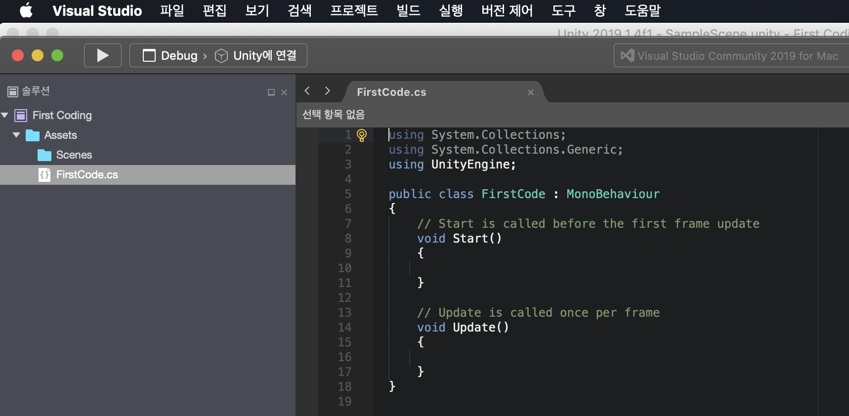 완성된 스크립트를 동작하려면 오브젝트를 만들어 스크립트를 오브젝트에 연결해야합니다. 빈 게임오브젝트를 생성하고 작성한 FirstCode를 붙입니다.