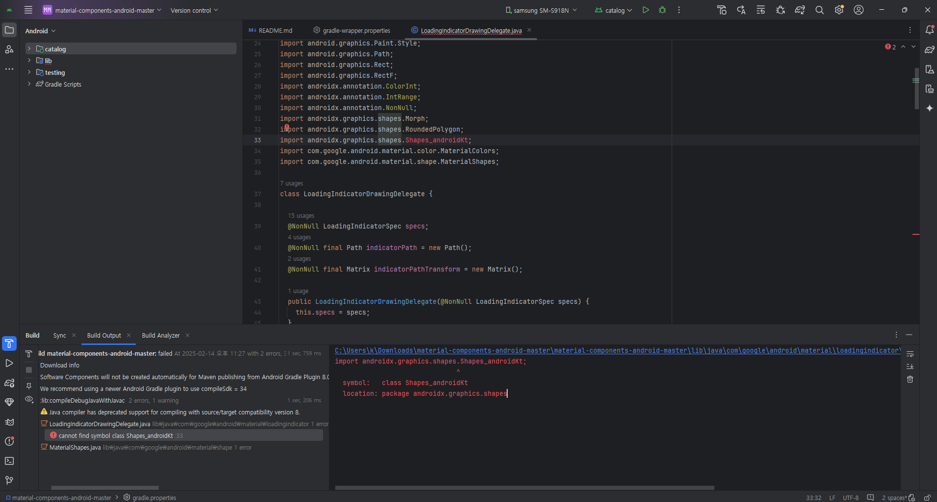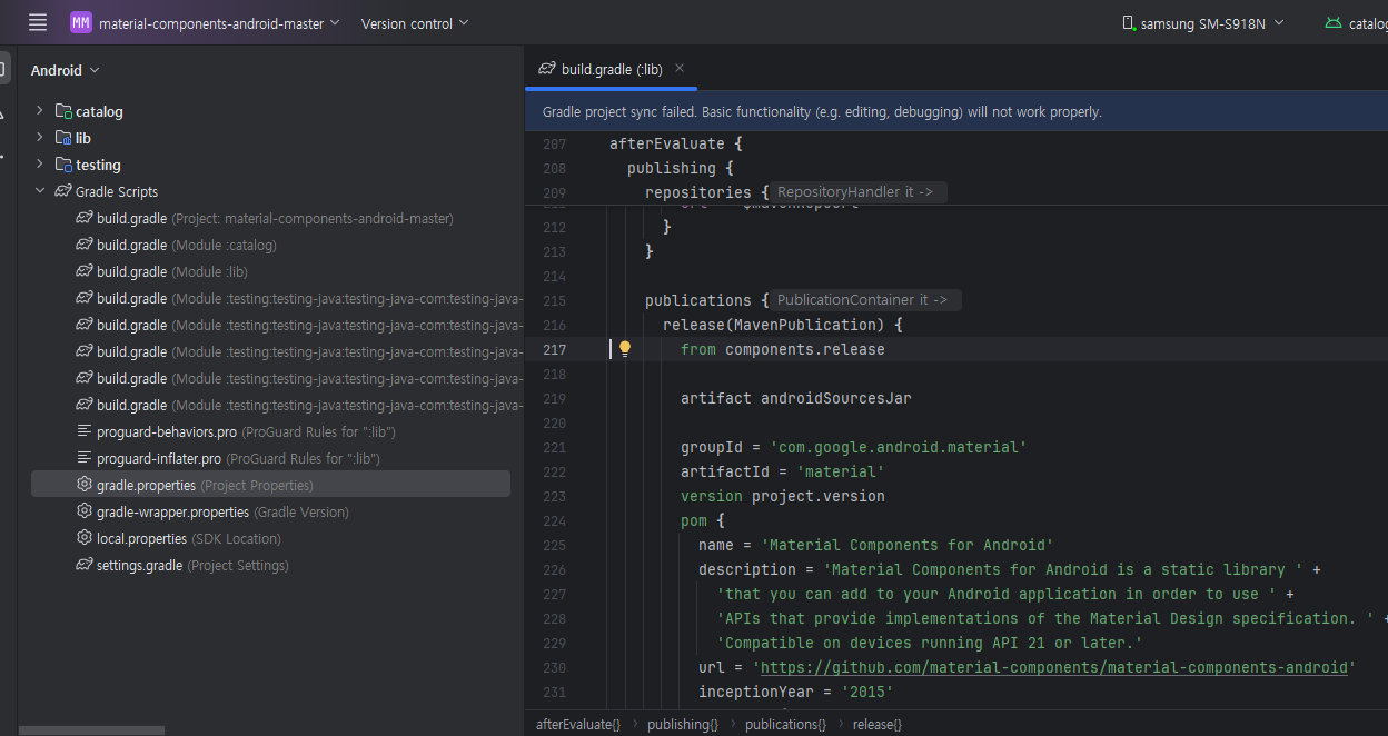 material-components-android 프로젝트를 실행하면 위와 같은 에러가 나타납니다.