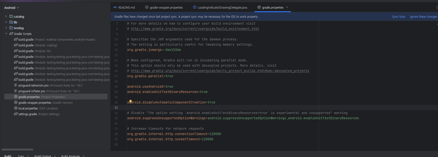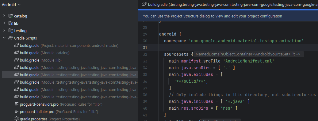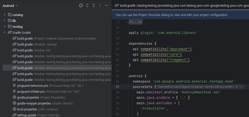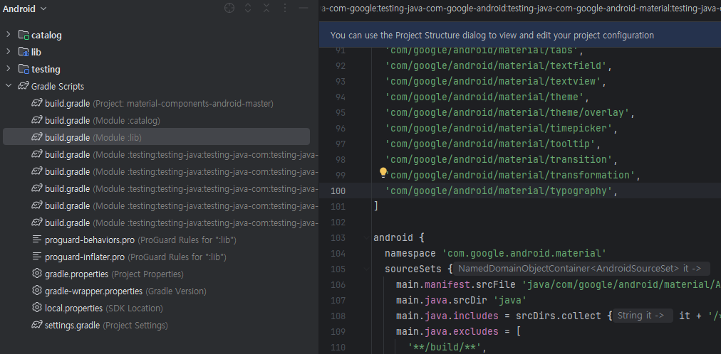 lib/build.gradle: 에 namespace 'com.google.android.material' 추가 후 Sync now 버튼 클릭