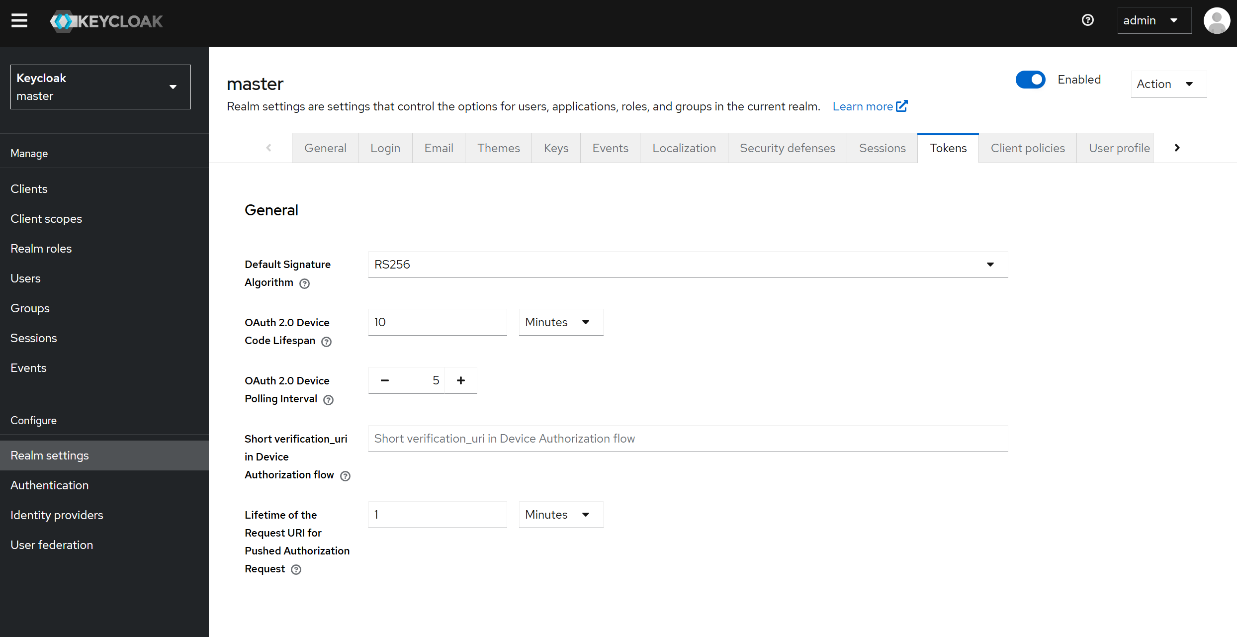 Realm Settings로 이동한 후 Tokens 탭을 선택해 realm의 활성 세션을 관리할 수 있습니다