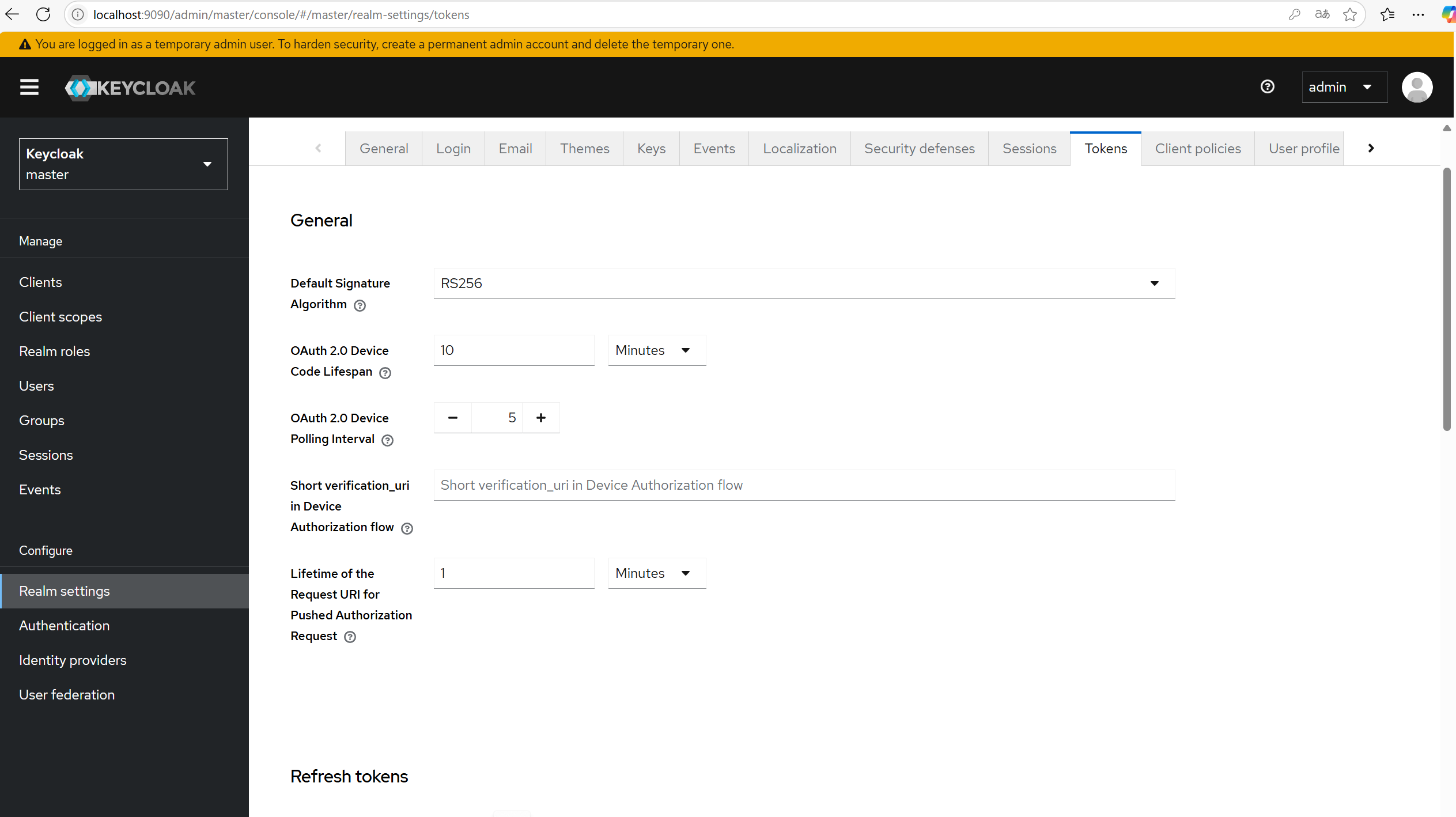 Keycloak에서 세션과 마찬가지로 토큰 생명주기를 설정할 수 있습니다. 해당 설정을 하려면 Realm Settings페이지에서 Tokens 탭을 클릭합니다. Tokens 탭에서 리프레시 토큰에 대한 특정 설정 정의를 포함해 ID토큰, 접근토큰,리프레시 토큰의 생명주기를 설정합니다.