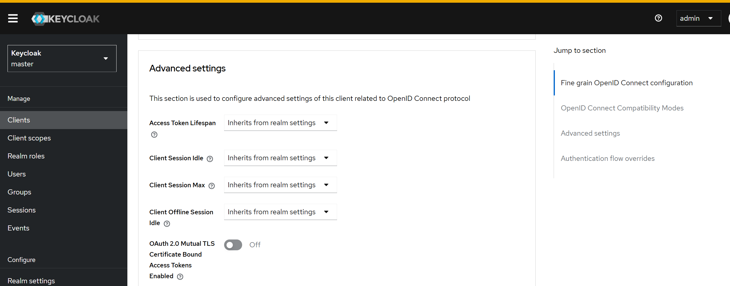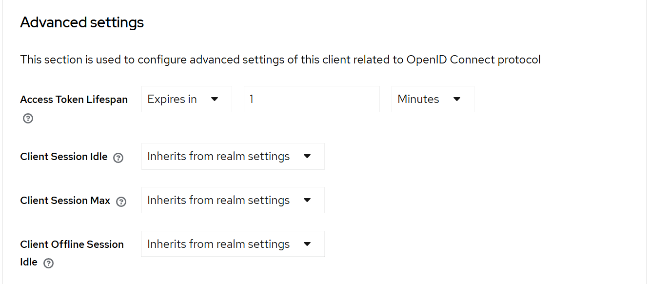 클라이언트 기반의 리프레시 토큰 생명주기를 재설정하려면 클라이언트의 상세 페이지로 이동한 다음 Advanced탭 > Advanced settings 섹션으로 이동합니다.