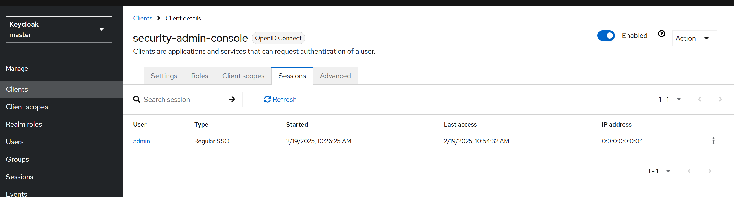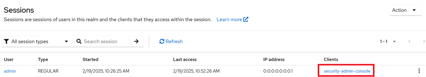 클라이언트를 선택하면 클라이언트 상세 페이지의 Sessions 탭으로 리다이렉트됩니다.
