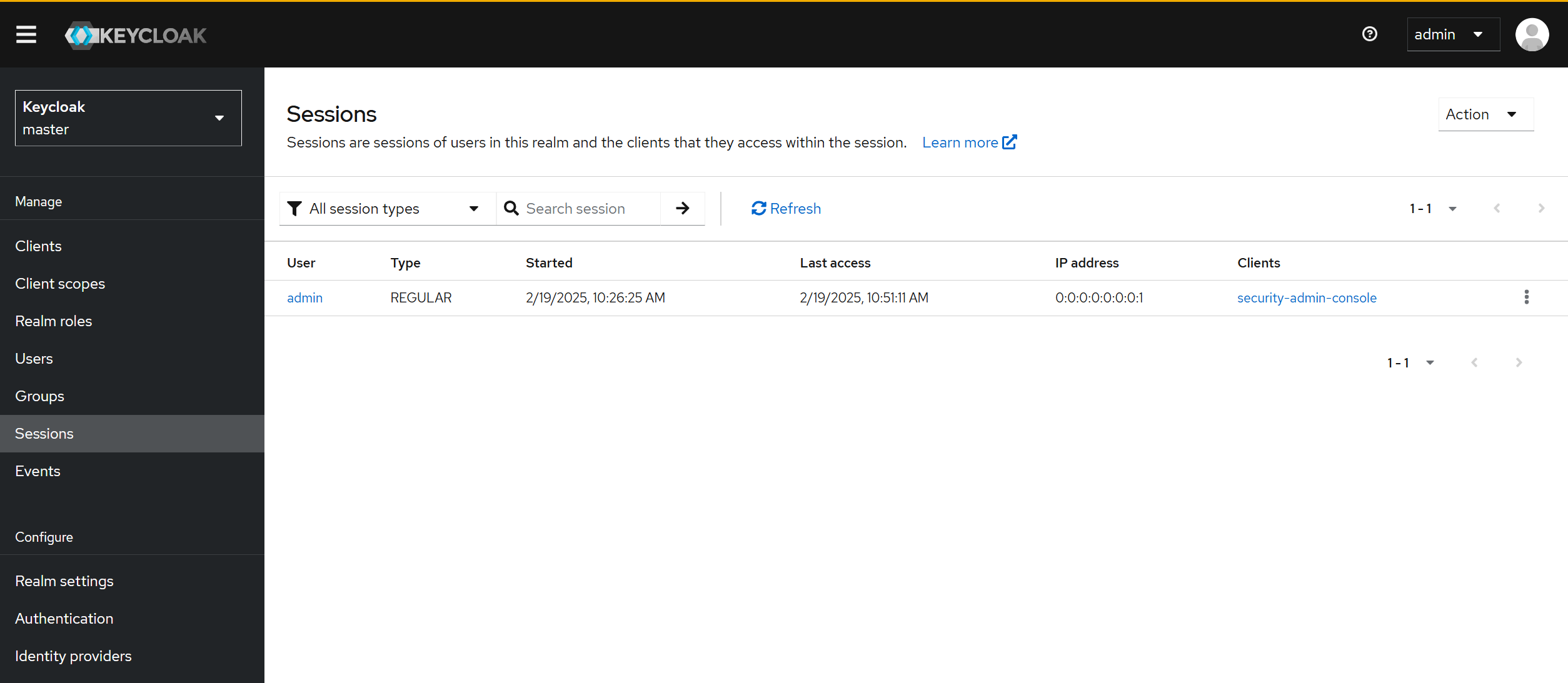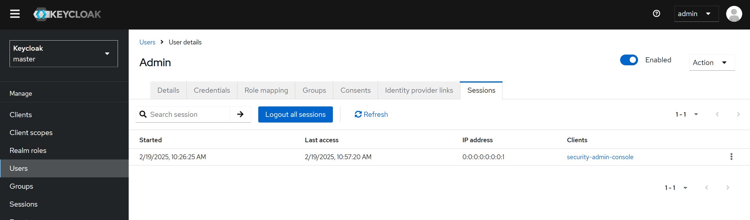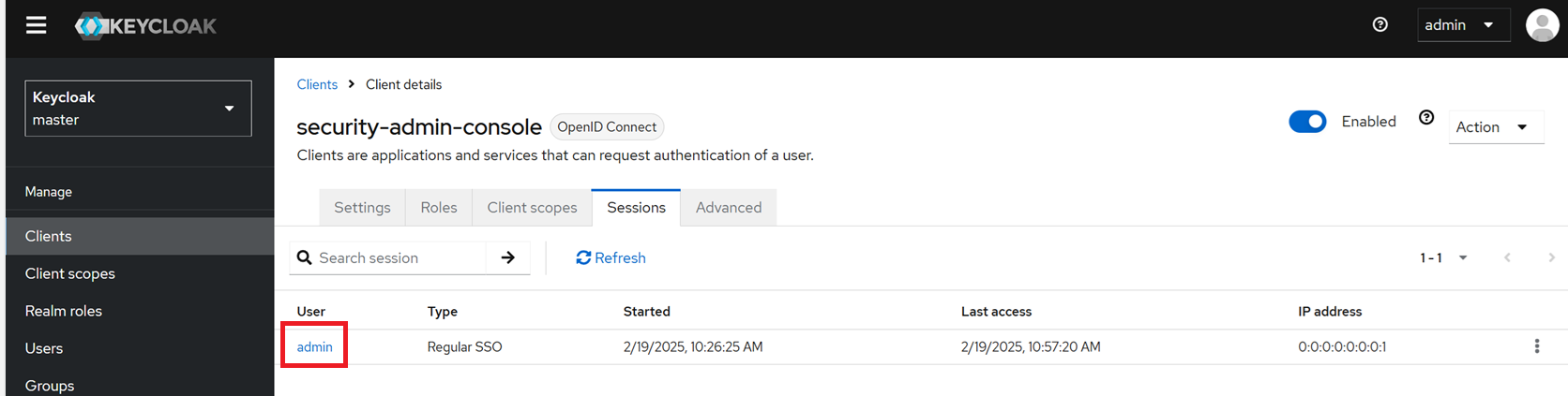해당 탭에서 세션이 시작된 시간, Keycloak이 사용자와 여러 클라이언트 및 클라이언트 세션에 대한 자세한 정보가 제공됩니다.