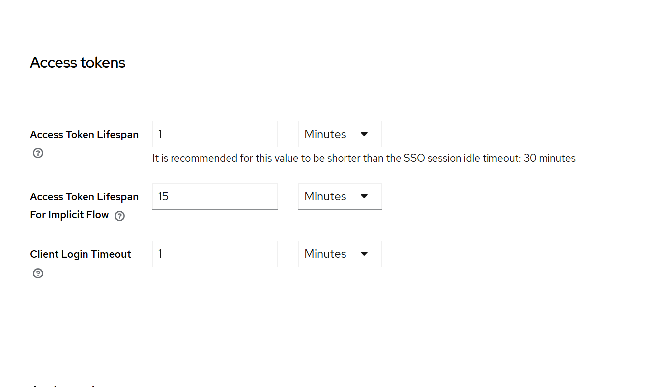 ID 토큰 및 접근 토큰의 경우 Access Token Lifespan 설정을 통해 생명주기를 설정할 수 있습니다.