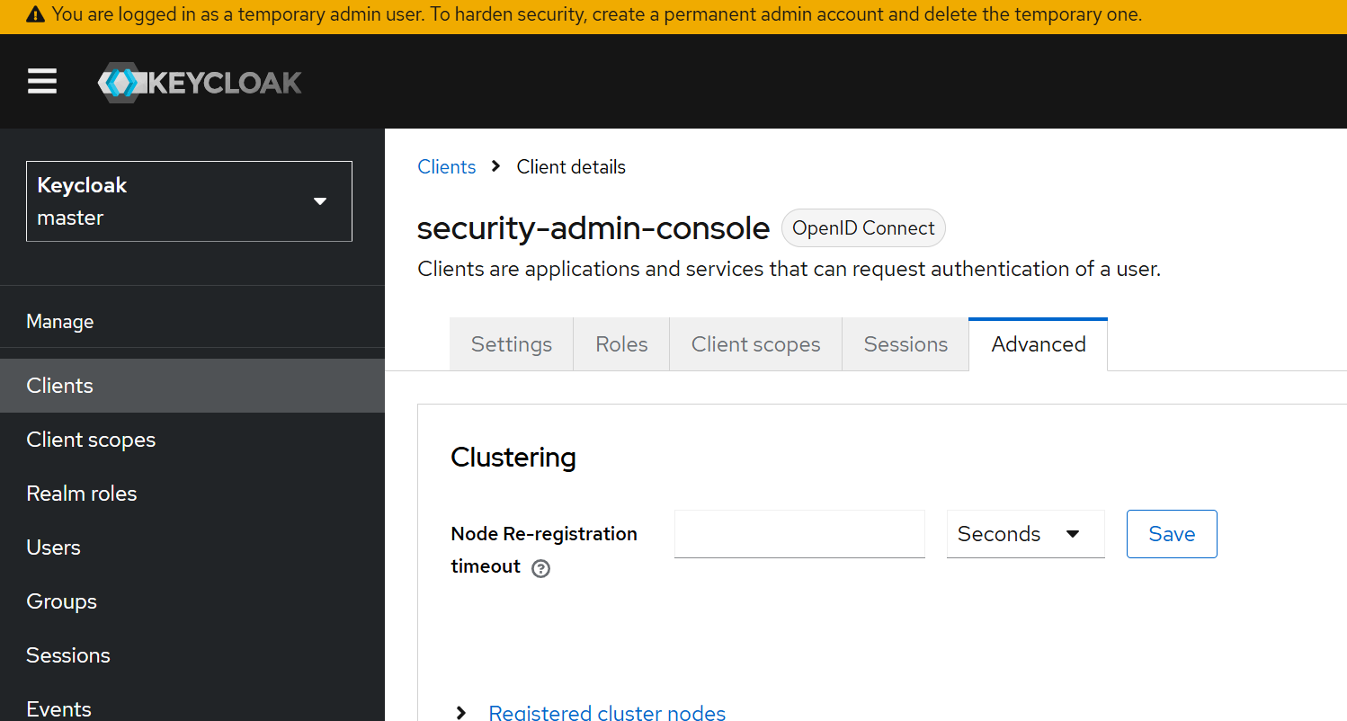 먼저 리프레시 토큰의 생명주기는 클라이언트 세션에 설정된 시간을 기반으로 계산되며 realm 수준의 Client Session Max를 설정하거나 동일한 설정을 클라이언트 기반으로 재설정합니다. 클라이언트 세션에 대한 생명주기나 명시적으로 설정되지 않은 경우, Keycloak은 SSO Session Max 설정에서 사용자 세션으로 설정한 값이 사용됩니다.