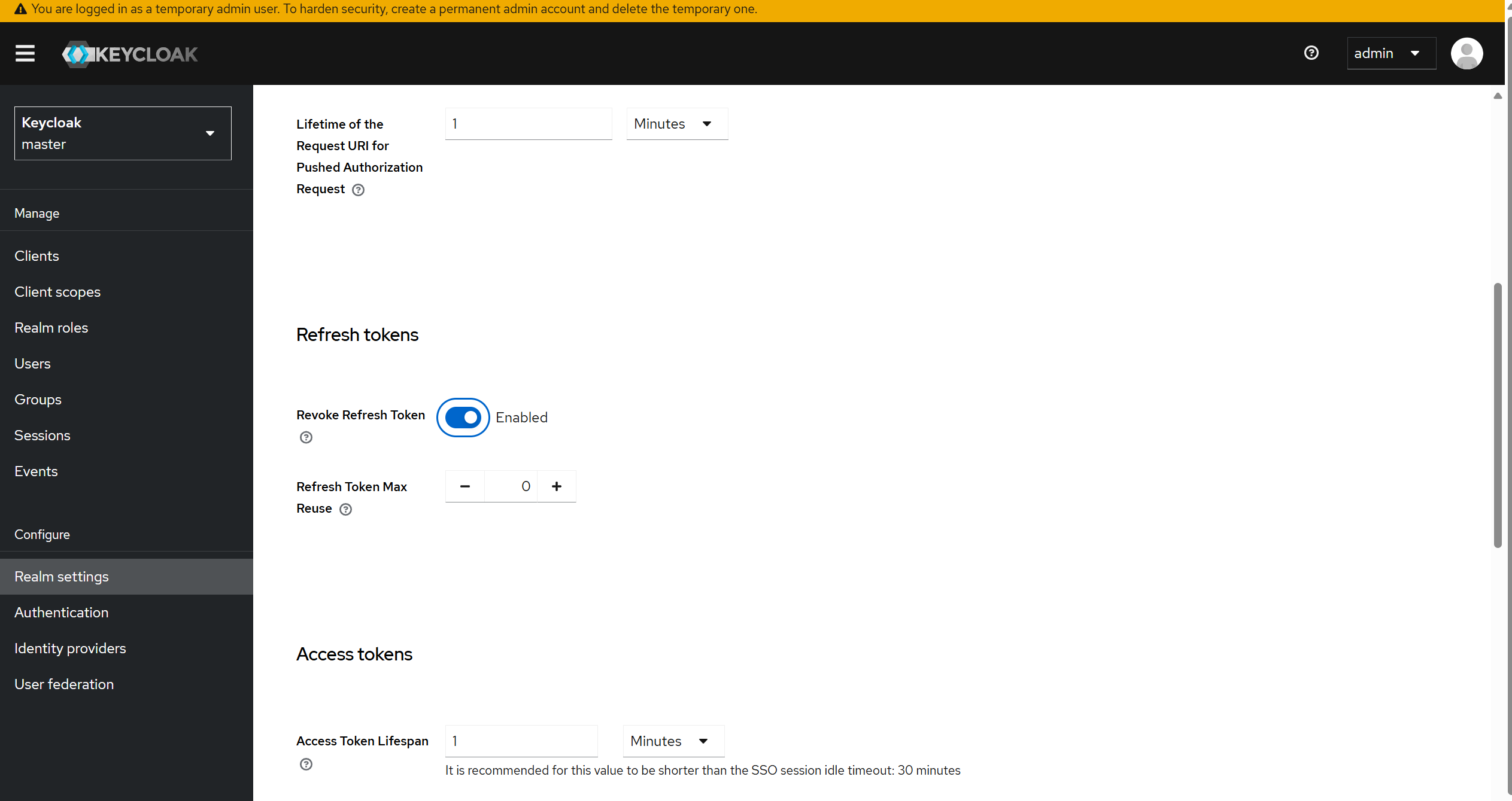 리프래시 토큰 로테이션을 활성화하려면 Realm Settings 메뉴에서 Tokens 탭으로 이동한 다음 Revoke Refresh Token 설정을 활성화합니다.