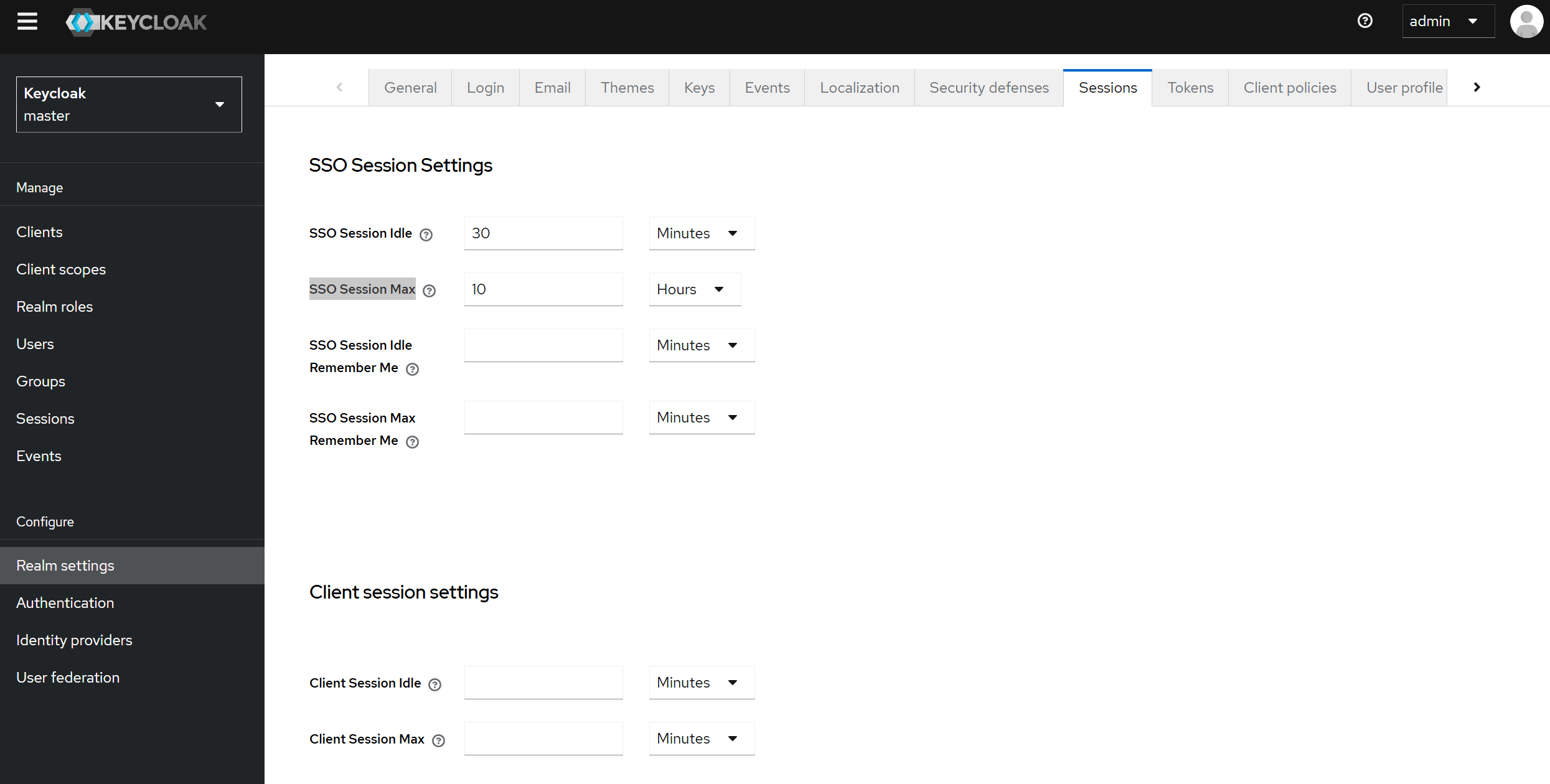 세션 생명주기를 설정하려면 좌측 패널의 Realm Setting > Sessions 탭을 클릭합니다.
