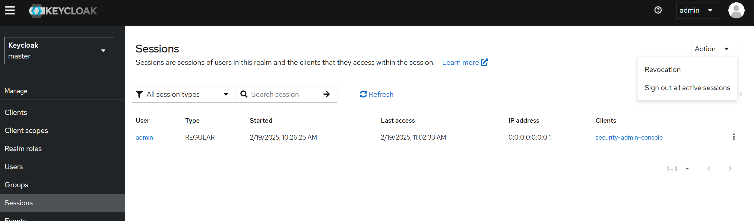 realm 레벨에서 활성 세션을 확인하는 경우 Action > Sign out all active sessions 버튼을 클릭해 realm 의 전체 활성 세션을 만료할 수 있습니다. Revocation(폐기, 무효화)란, 발급된 인증 정보(예: 토큰, 인증서, 권한)를 더 이상 사용할 수 없도록 무효화하는 과정입니다.