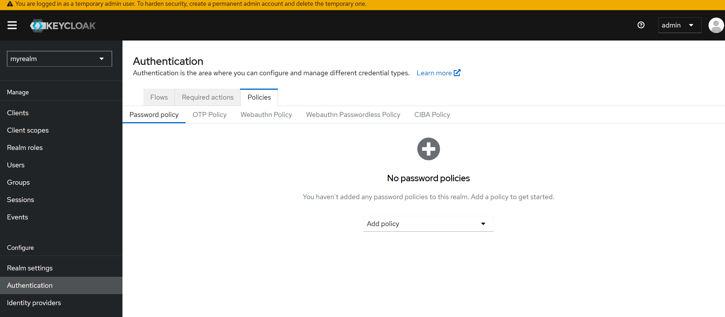 패스워드 정책을 설정하려면 Keycloak 관리자 콘솔을 열고 설정하고자 하는 realm을 선택합니다. 그다음 Authentication을 클릭한 다음 Policies 탭을 선택 > Password Policy탭을 선택합니다.