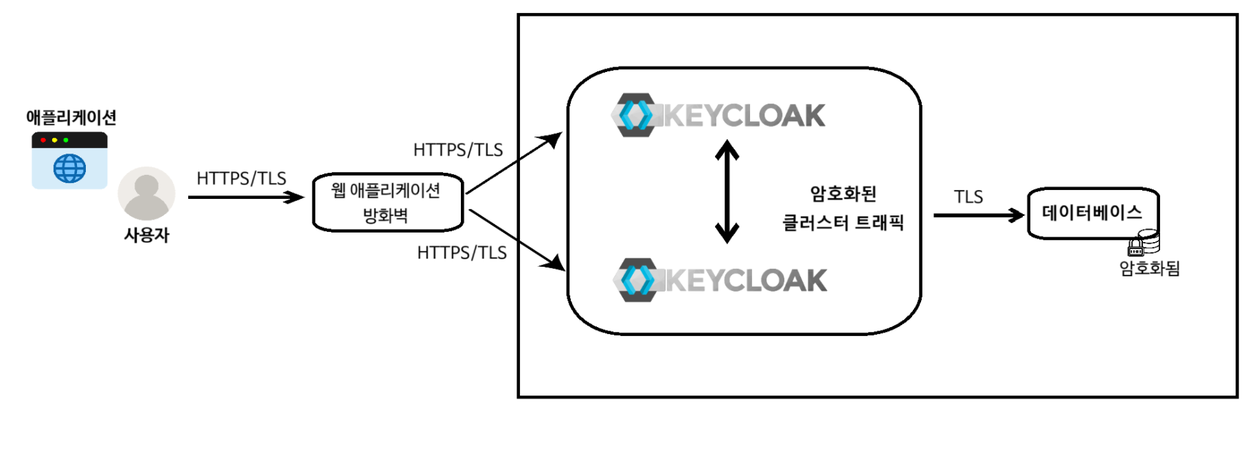 Keycloak과 해당 데이터베이스는 웹 애플리케이션 방화벽(WAF, Web Application Firewall)을 사용해 사용자 및 애플리케이션으로부터 격리되며 모든 네트워크 요청이 암호화되고 데이터베이스도 암호화됩니다.