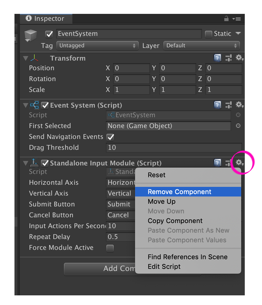 컴포넌트를 추가할때는 인스펙터 창에서 Add component 버튼을 클릭하여 추가합니다. 반대로 기존 컴포넌트를 제거할떄는 마우스 오른쪽버튼 또는 톱니 버튼을 클릭하여 Remove Component버튼을 클릭합니다.