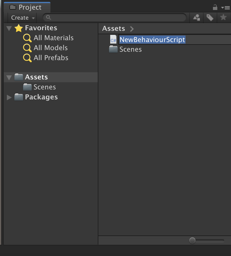 생성을 완료하였으면 C#스크립트 파일을 작성합니다. 프로젝트 창 왼쪽 상단의 create > c# script 클릭