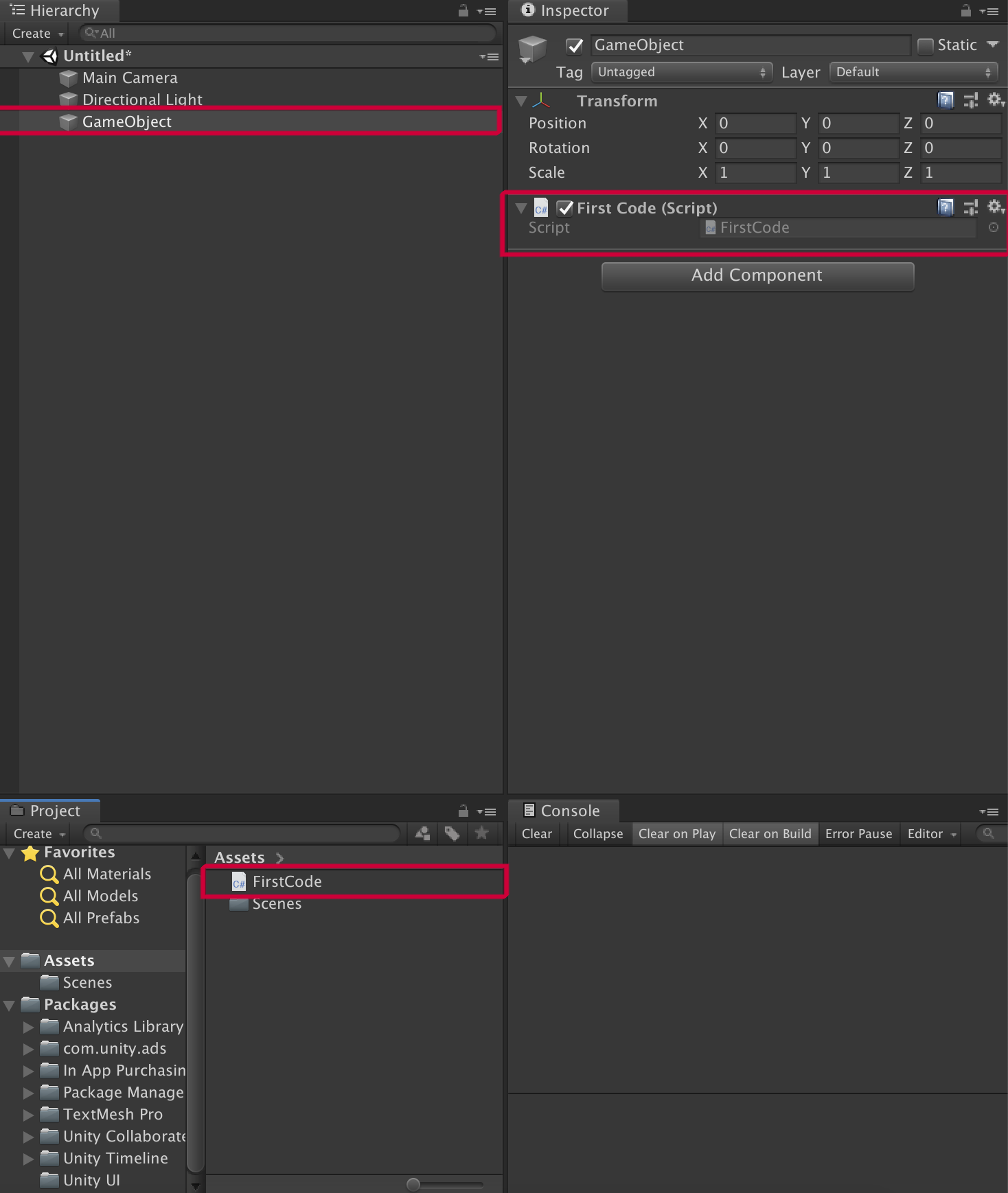 완성된 스크립트를 동작하려면 오브젝트를 만들어 스크립트를 오브젝트에 연결해야합니다. 빈 게임오브젝트를 생성하고 작성한 FirstCode를 붙입니다.