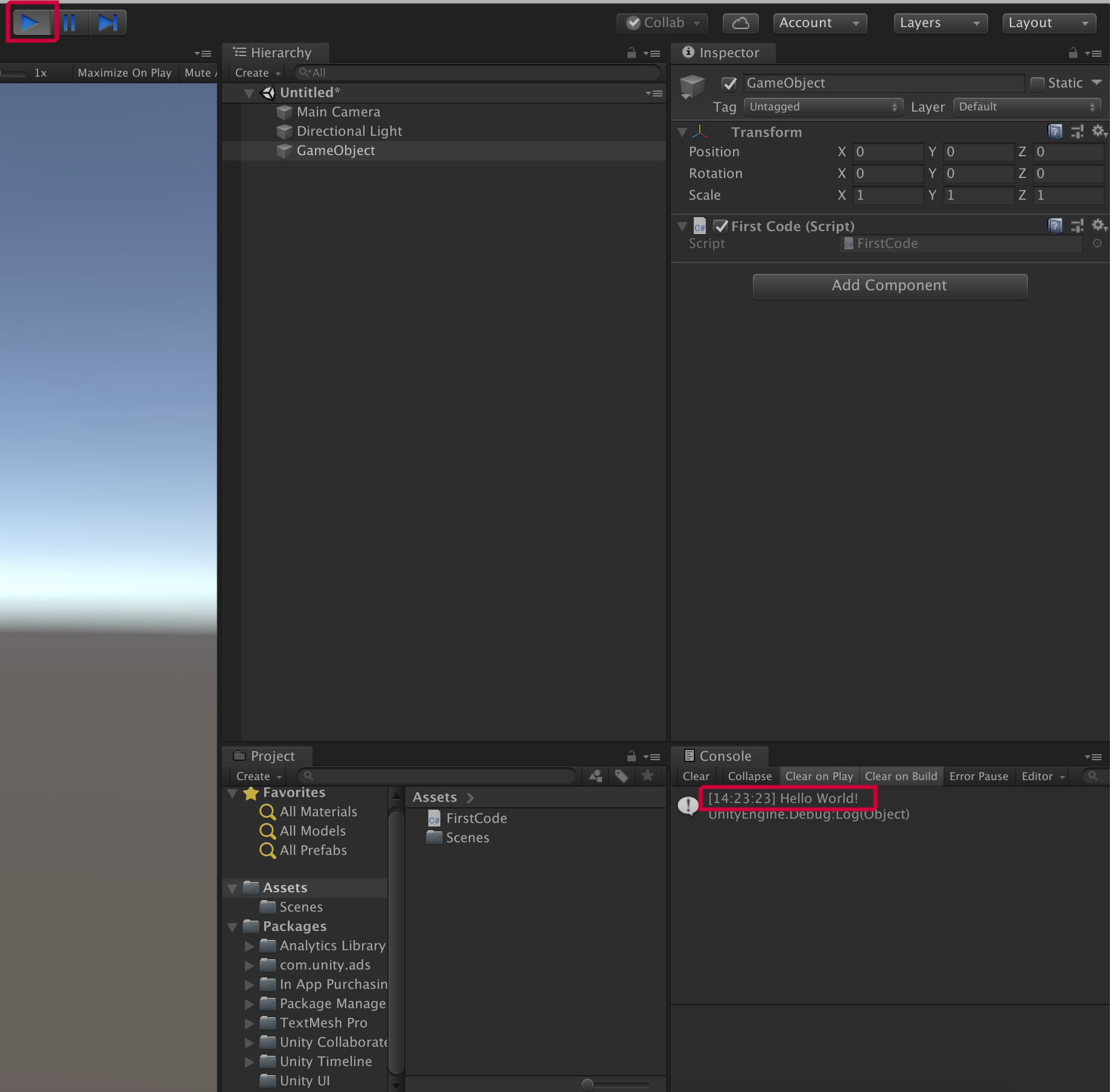 플레이버튼을 눌러 플레이모드에 진입합니다. 아래와 같이 console창에 Hello World라는 문구가 출력된것을 확인할 수 있습니다.