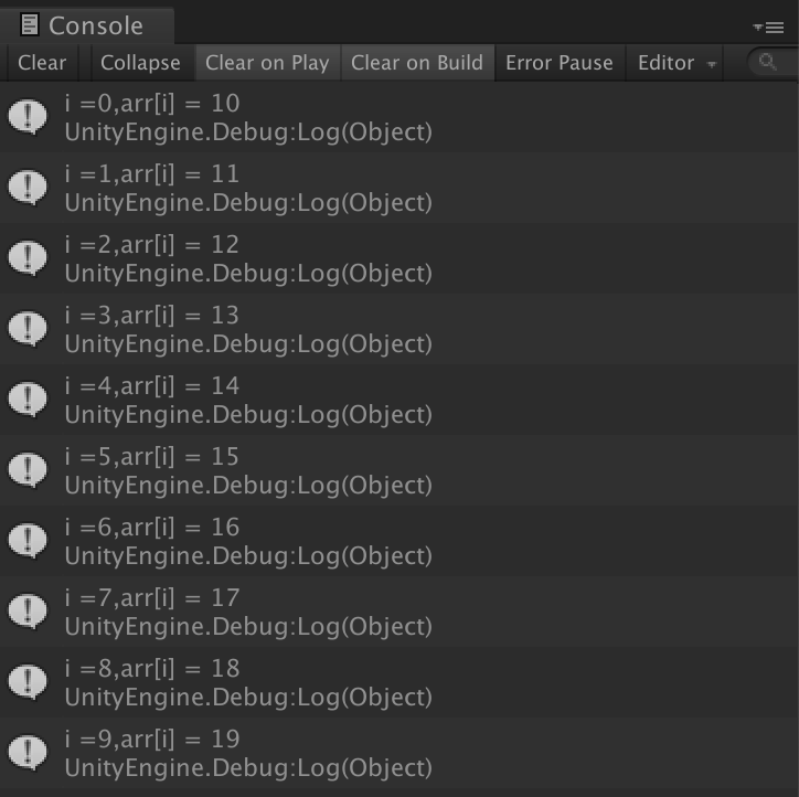 Debug.Log("i =" + i + ",arr[i] = " + arr[i]);