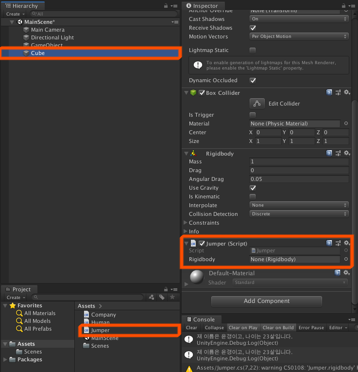 project창의 Jumper스크립트를 Cube오브젝트에 드래그앤드롭합니다. 연결이 완료되면 Inspector창에 아래 그림과 같이 Jumper스크립트가 연결된 것을 확인할 수 있습니다.