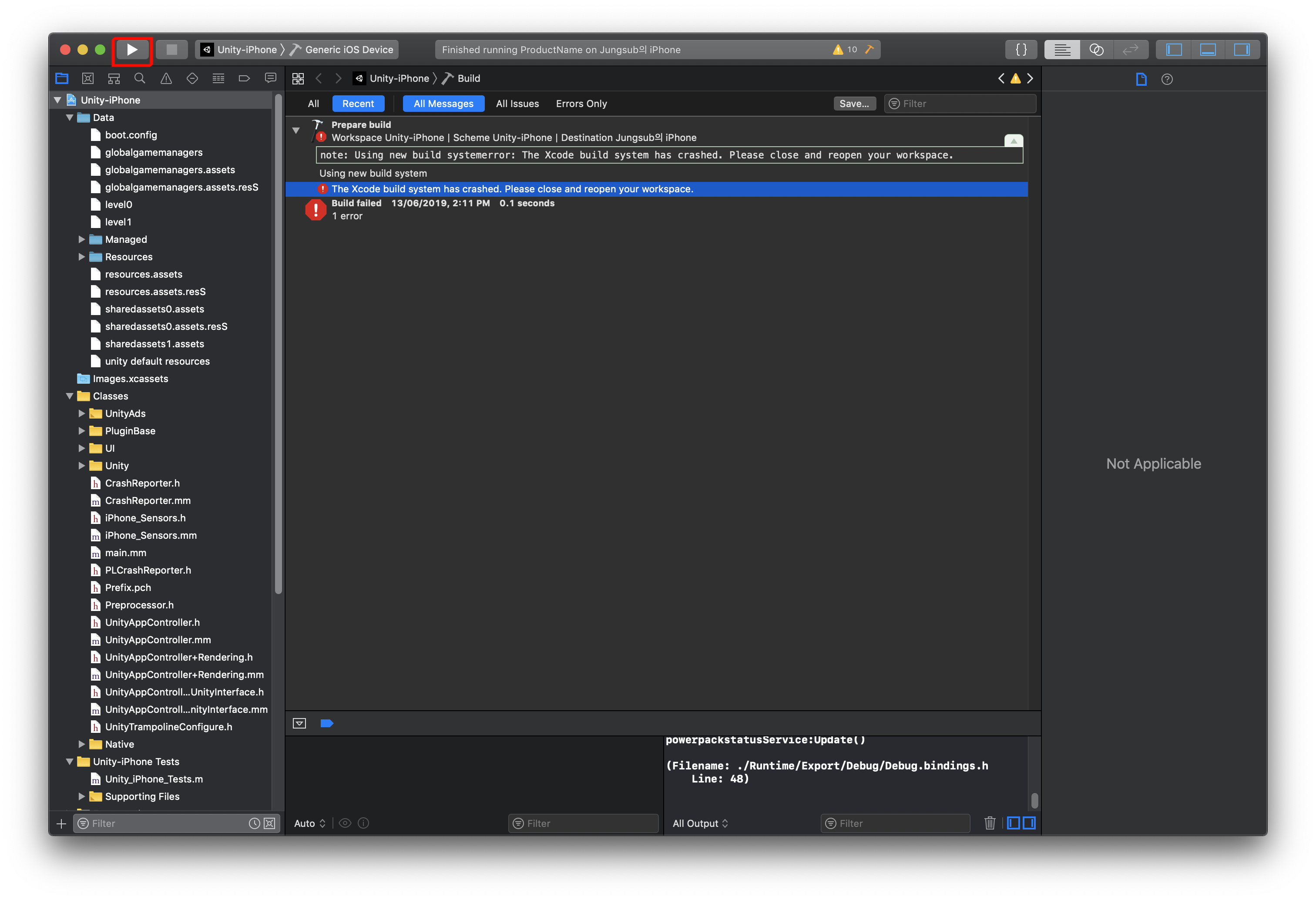 [xcode] Using new build systemerror: The Xcode build system has crashed. Please close and reopen your workspace.