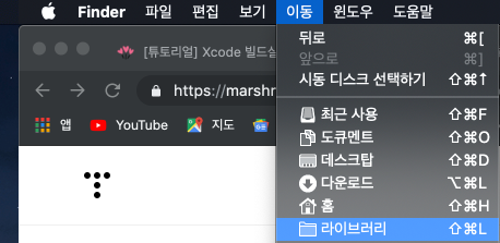 Finder 창을 열어 이동 -> 라이브러리 클릭