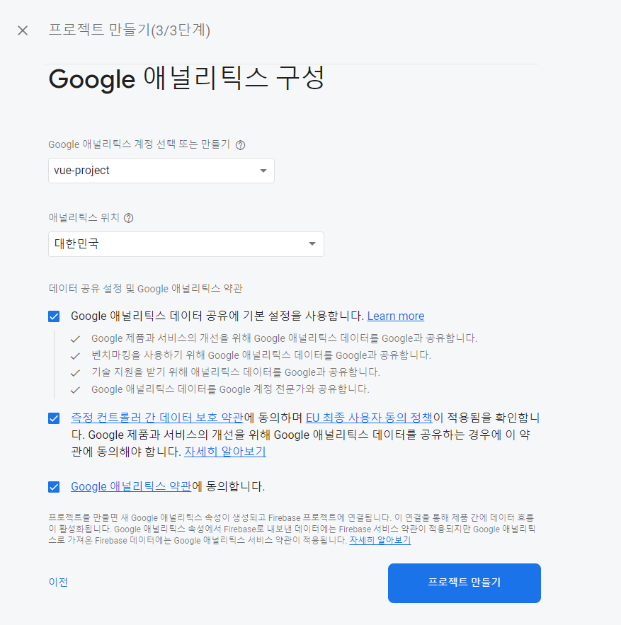 구글 애널리틱 계정 생성후 계정선택 -> 대한민국선택 -> 약관동의 한 후 프로젝트 만들기 버튼을 눌러 프로젝트를 생성합니다.