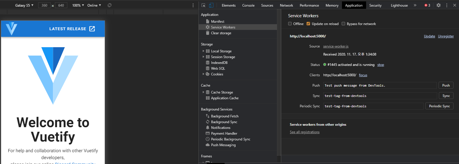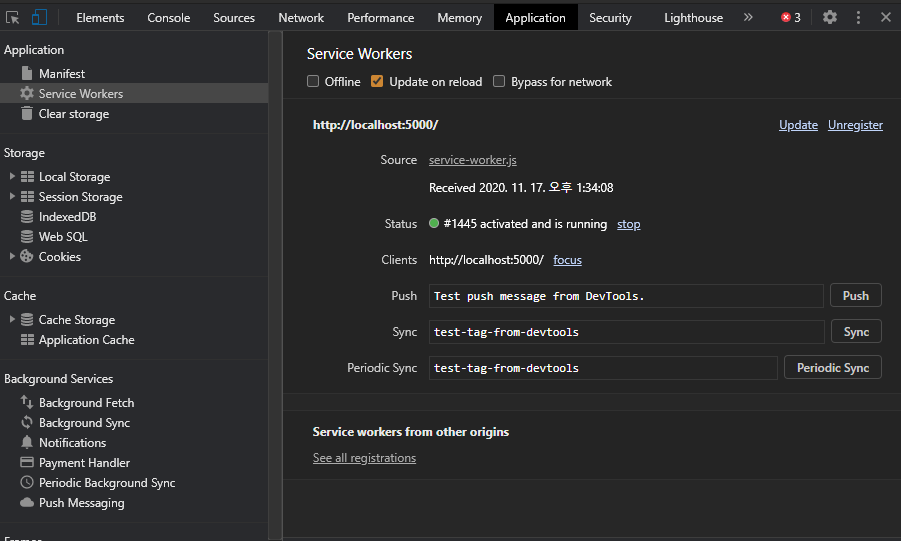 화면에 보이는 항목중 Status를 확인해보면 activiated and is running 이라는 문구와 함께 초록색 동그라미가 확인된다면 서비스 워커가 잘 동작하고 있다는 뜻입니다