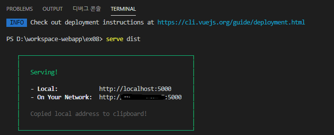 만약 노드 패키지를 설치하지 않았다면 npm install 을 터미널에 입력하고 만약 소스를 변경하였다면 npm run serve 도 이어서 입력합니다.