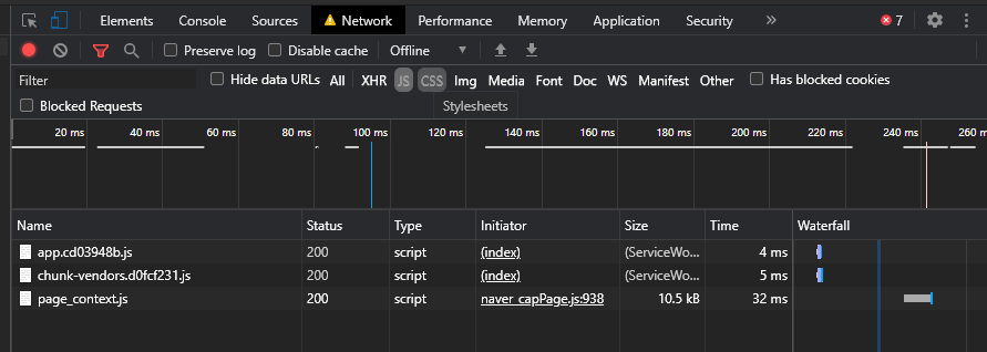 Network 탭에서 Offline 모드로 바꾸고 새로고침 했을 때 빨간색 파일 (status failed)은 캐시되지 않은 파일입니다.