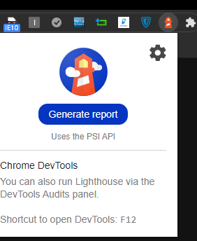 추가가 완료되면 주소창 오른쪽에 아이콘이 생깁니다. 성능을 평가하고 싶은 웹사이트에 접속한 상태에서 이 아이콘을 클릭한 후 Generate report를 클릭하면 잠시 후 결과 보고서를 보여줍니다.