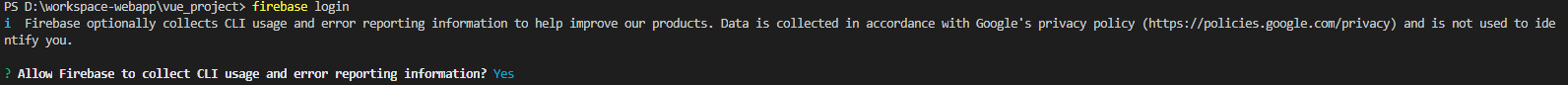 firebase CLI가 오픈 인증을 사용해도 되냐는 질문에 Y를 입력하고 Enter를 누릅니다.