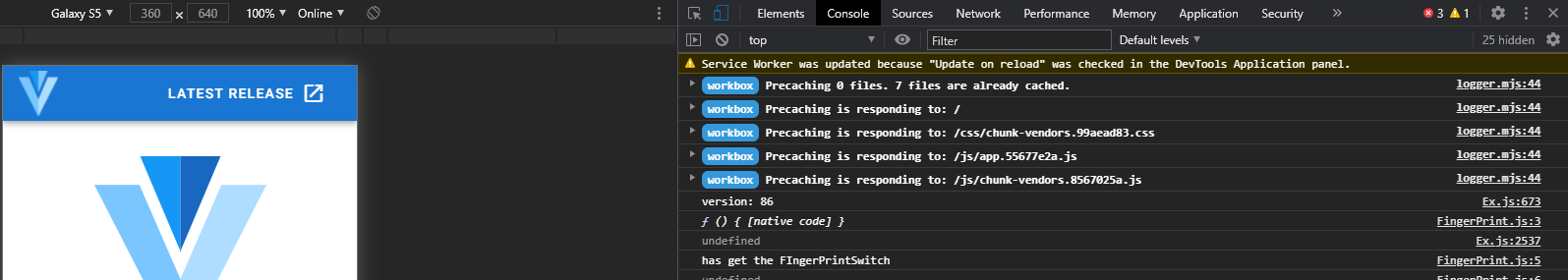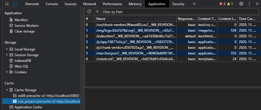 Vue-CLI를 사용한 PWA 템플릿은 내부적으로 워크박스를 사용하므로, 자동으로 생성된 서비스 워커를 통해서 *png, *.js, *.css 파일의 기본 캐시를 제공합니다.