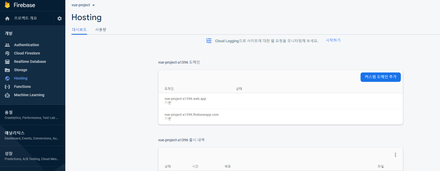 수정사항이 있을경우 firebase deploy 명령만 다시 실행하면 됩니다. 개인 도메인이 있다면 파이어베이스의 Hosting 메뉴에서 커스텀 도메인을 추가버튼을 눌러 다른 URL로도 연결가능합니다.