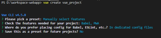 두번쨰 옵션질문에서 Babel을 선택해 ES6+로 작성한 자바스크립트가 모든 브라우저에서 실행될 수 있게하고, PWA도 함께 선택해 그자리에서 바로 PWA를 제작할 수 있게 합니다.