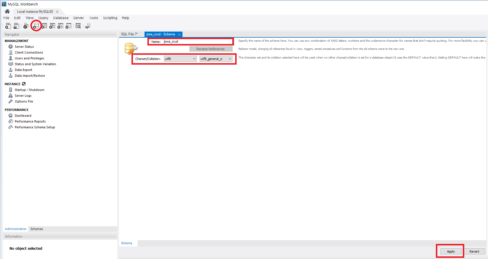 mysql workbench를 열어 스키마 추가 버튼 클릭 -> 스키마명 작성