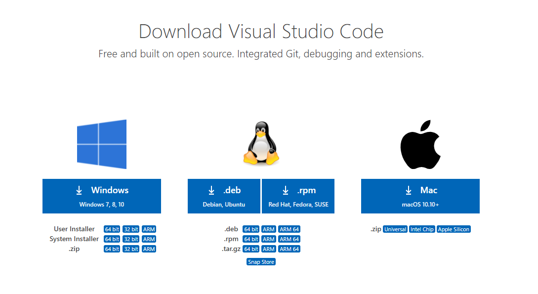 비주얼 스튜디오 코드 공식 홈페이지의 다운로드 페이지(https://code.visualstudio.com/download)에서 다운로드 버튼을 클릭하여 VS Code 설치를 진행합니다.