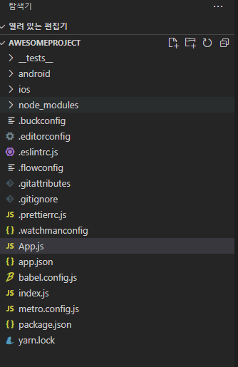 VSCode에서 프로젝트를 열면 생성된 App.js 파일을 찾을 수 있습니다.