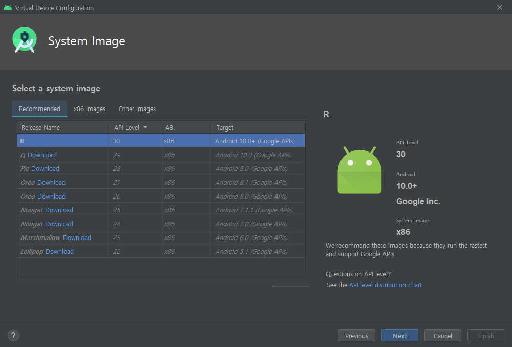 테스트하고싶은 안드로이드 OS 버전을 선택 한 후 Next