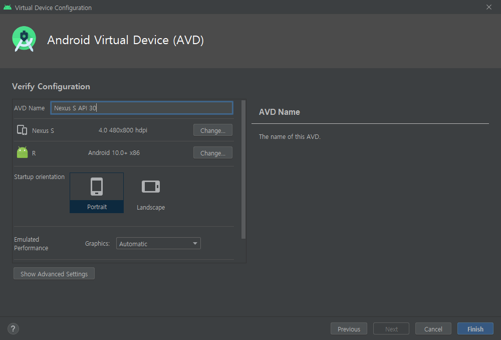 AVD 이름을 알아보기 쉽게 적어둔 다음에 Finish를 합니다.