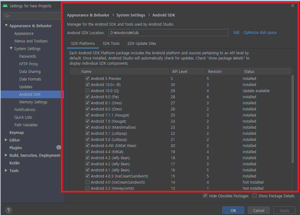 SDK Platforms 탭에서 사용할 디바이스들 선택 (저는 Android4.0 상위 버전 모두 선택하였습니다.)