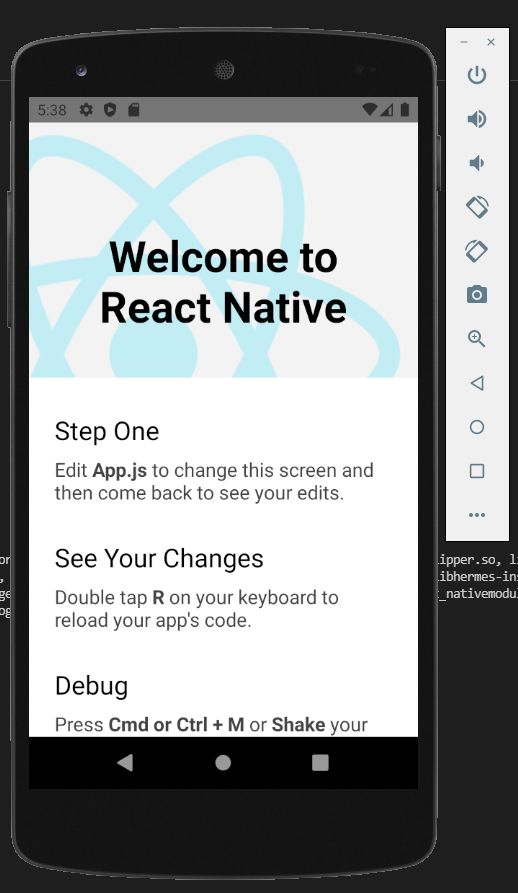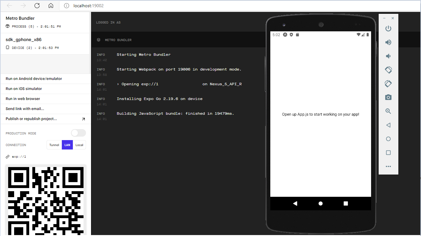 다시 Expo가 실행된 웹브라우저로 가서 Run on Android Device/emulator를 클릭하면 아래와 같이 에뮬레이터에서 실행되는 것을 확인할 수 있습니다.