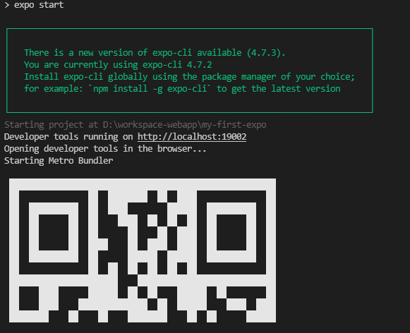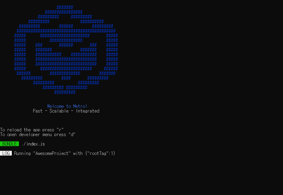 실행되면서 터미널창이 실행되는데 터미널에 출력되는 Metro는 리액트 네이티브를 위한 자바스크립트 번들러로서 리액트 네이티브가 실행될때마다 자바스크립트 파일을 단일 파일로 컴파일하는 역할을 합니다.