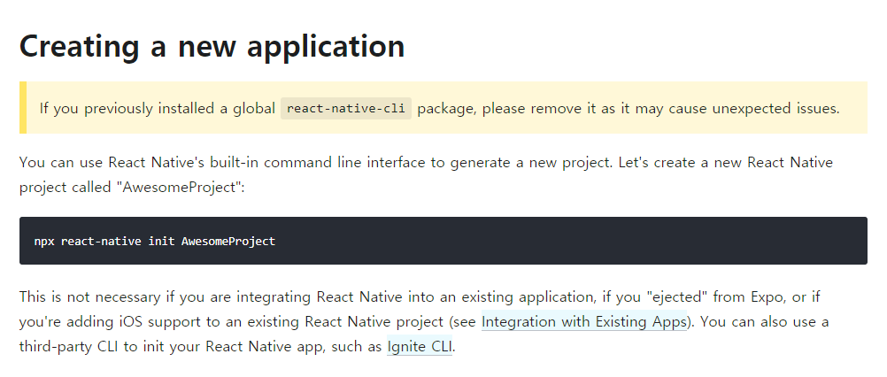 아래의 npm 명령어를 통해 React Native CLI 프로젝트를 생성합니다. (리액트 네이티브 사이트 참조)