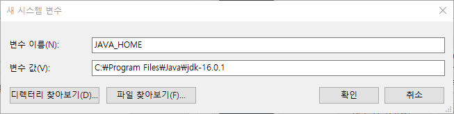 환경변수 설정을 위해 설치된 자바 경로로 이동합니다. (C:\Program Files\Java\jdk-16.0.1)