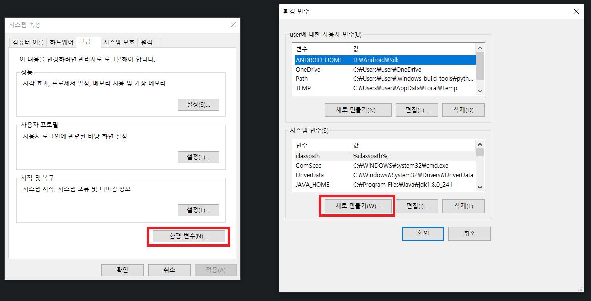 * 시스템 속성 -> 환경변수 클릭 -> 새로만들기 클릭