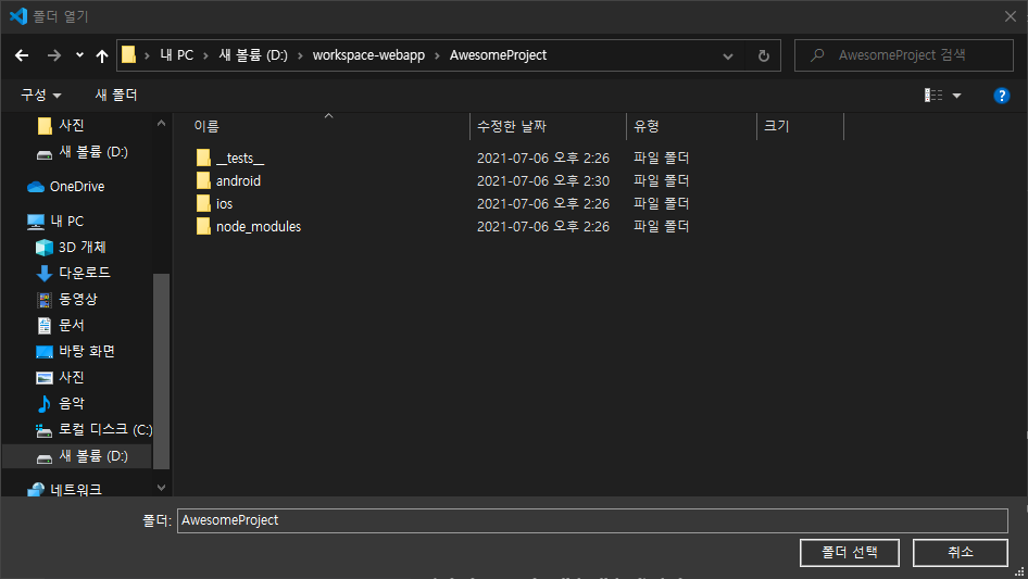 VScode를 열어 파일 -> 폴더열기를 눌러 생성한 CLI 폴더를 엽니다.