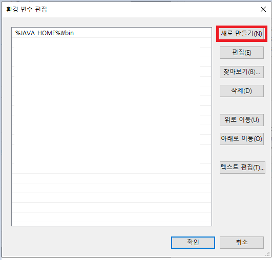 %JAVA_HOME%\bin 입력 후 확인 버튼을 클릭합니다.