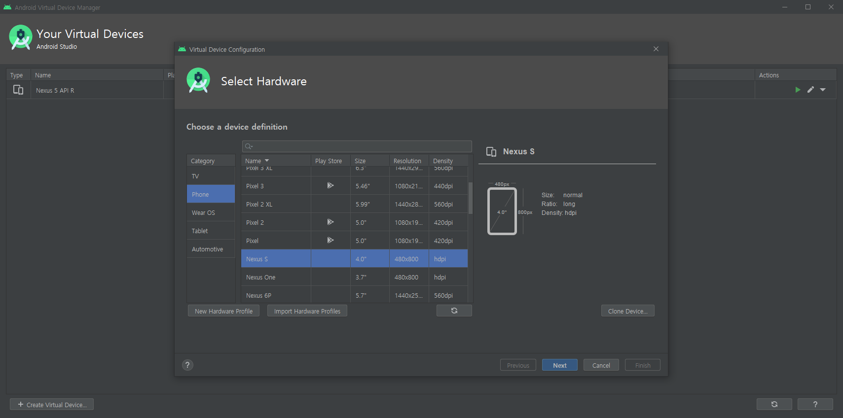 Create Virtual Device.. 버튼을 눌러 테스트할 디바이스를 선택한 후 Next 버튼을 누릅니다.